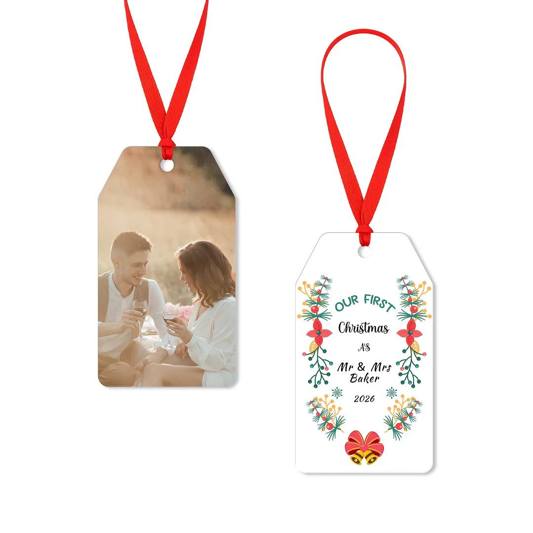 Add a personal touch to your holiday season with this elegant gift tag–style Christmas ornament. Made from premium acrylic and featuring double-sided printing, it allows you to showcase your favorite photo on one side and a meaningful message or date on the other. The sleek shape, glossy finish, and red hanging ribbon make it a perfect accent for Christmas trees, gift wrapping, or wedding keepsakes. A timeless way to capture love and celebrate special moments.