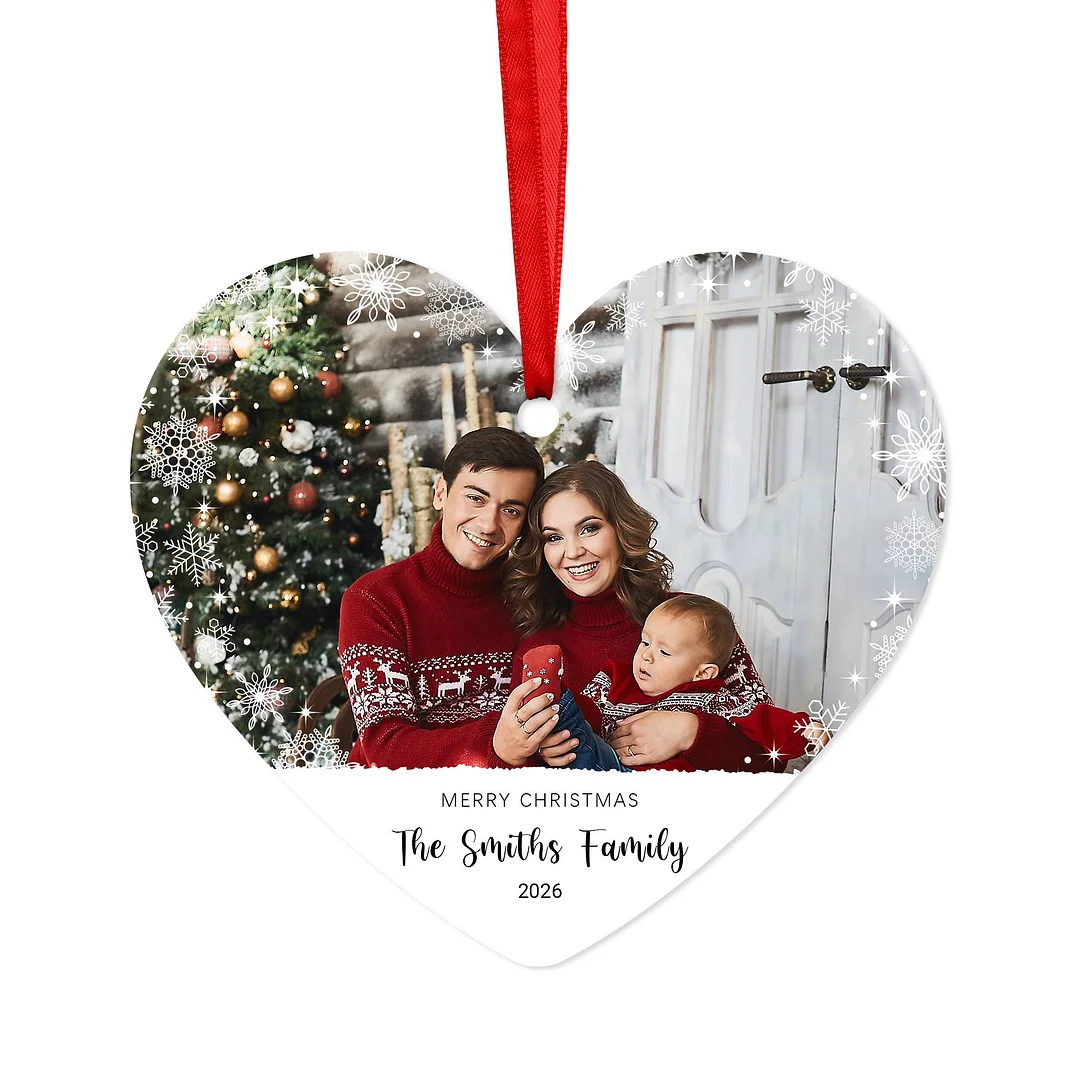 Make your Christmas extra special with a personalized heart-shaped ornament that beautifully captures your favorite holiday memories. Crafted from high-quality white acrylic and double-sided printing, this lightweight and durable ornament is perfect for showcasing a custom family photo, couple portrait, or a meaningful moment. The heart shape adds a touch of warmth and love, making it a perfect gift or keepsake for the holiday season. Easy to hang on your Christmas tree or gift bag with the included red ribbon.