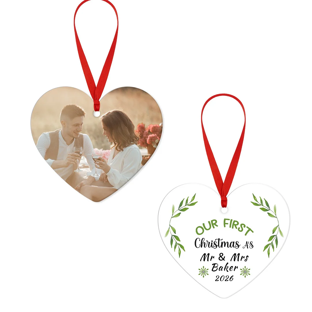 Celebrate love and holiday memories with this beautiful heart-shaped Christmas ornament. Made from premium acrylic and featuring double-sided printing, this keepsake lets you personalize one side with a photo and the other with names, dates, or a meaningful message. Its glossy finish and festive red ribbon make it a perfect decoration for Christmas trees, wedding celebrations, or anniversary gifts. A timeless ornament designed to capture your most cherished moments.
