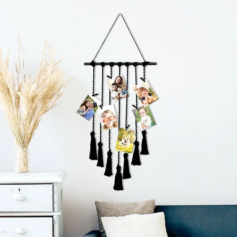 Woven Wall Hanging Photo Tapestry Boho Home Decor, With 25 Wood Clips as gifts, This wall decor photo display is an art to show your favorite photos. Create a warm and romantic family atmosphere. Whether you are with your family or not, you can see the happiest photos of your family at the woven wall hanging tapestry every day.
